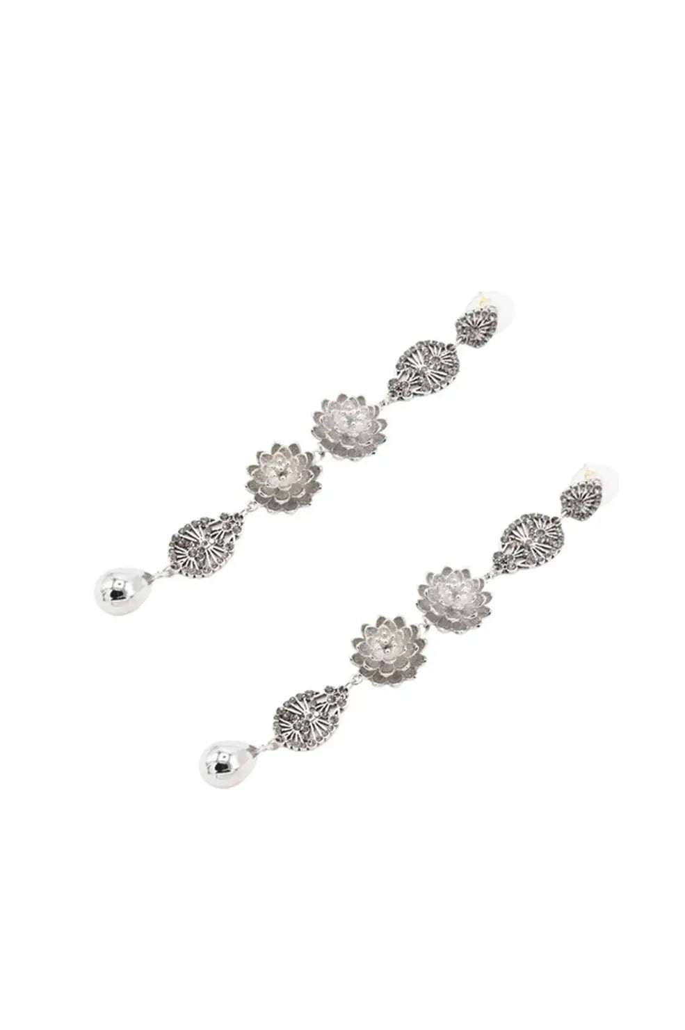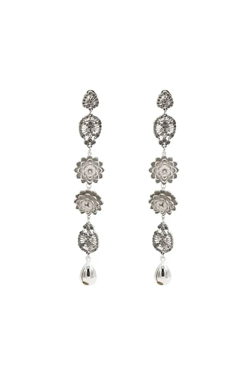 Pendientes largos de latón, con dos piezas con forma de flor y gotas con cristales.